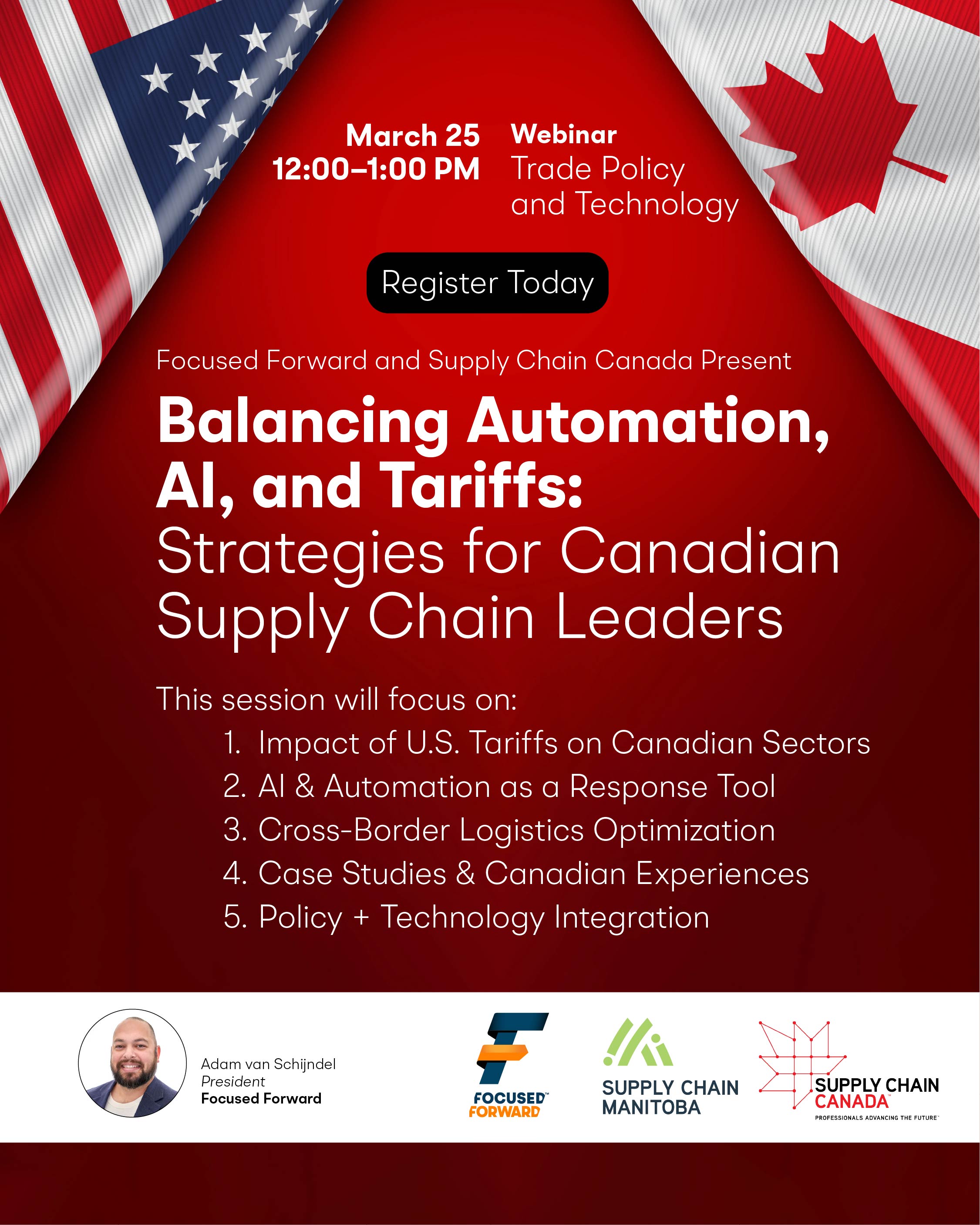 Supply Chain Manitoba, Supply Chain Canada Central Region, in collaboration with Focused Forward, are hosting a trade policy and technology webinar. This session will focus on the intersection of trade policy and technology. The ongoing and potential future tariffs imposed by the U.S. on Canadian goods (and vice versa) create volatility and complexity in supply chain management. Automation and AI tools can play a significant role in risk mitigation, cost modeling, and operational agility.